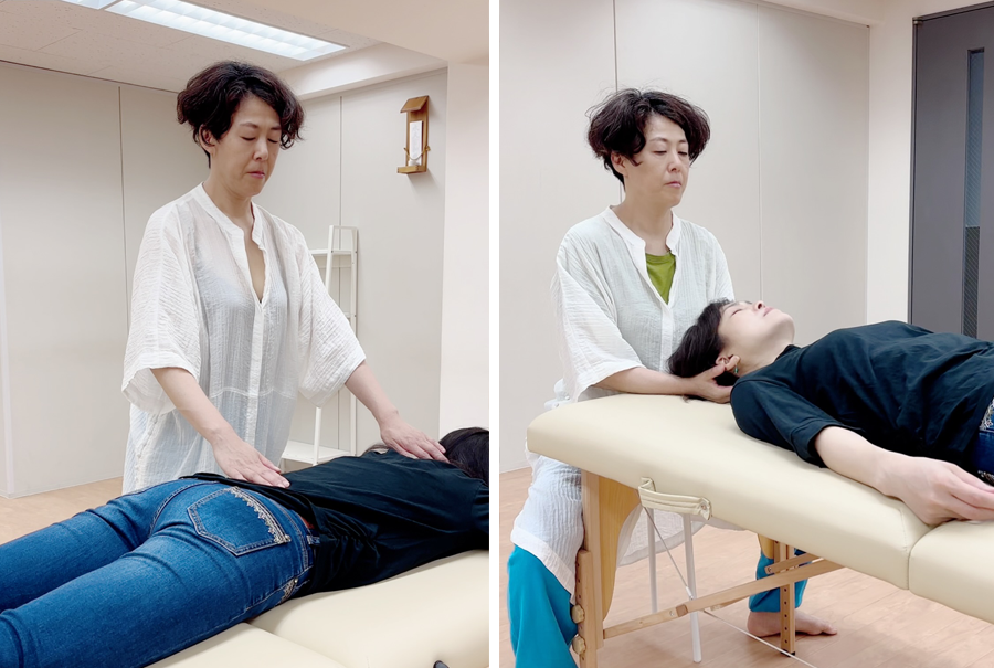 セッションでは、必要に応じて、優しいタッチ・ストレッチ・指圧・加圧・揺らしなどのさまざまなテクニックを使い、エネルギーの流れを活性化させ、緊張を解いていきます。また、クラニオタッチにより肉体面での中心構造の脳脊髄液の流れを促します。